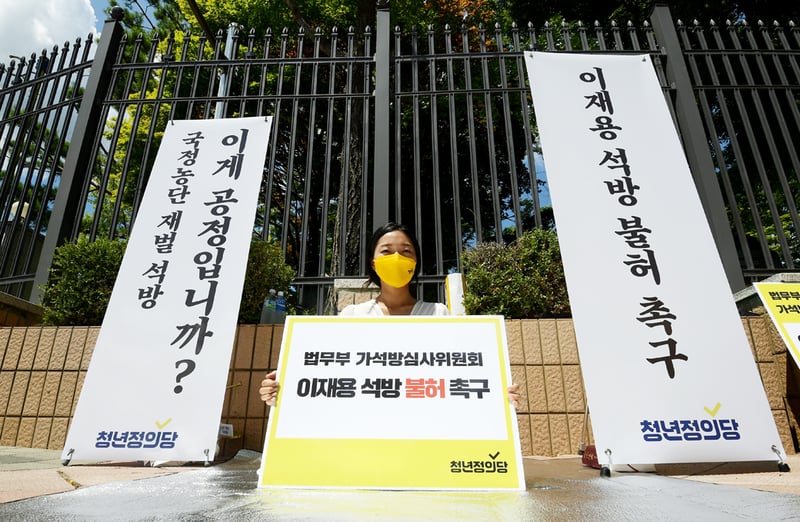 속보 이재용 가석방 확정 453. 3중고 구입한 김치냉장고서 현금 1억 발견…경찰 수사. 가석방 심사 앞두고 '이재용 석방' 요구·전망 쏟아져. 21일 법조계에 따르면 서울구치소가 법무부에 보고한 광복절 가석방 심사 대상자 명단에 이 부회장이 포함된 것으로 전해졌다. 가석방 조건에 부합하지 않는 이재용 부회장을 풀어주면 재벌 특혜 관행이 이어지게 되고 국민적인 분노에 직면하게 될 것이라는 경고가 따른다.